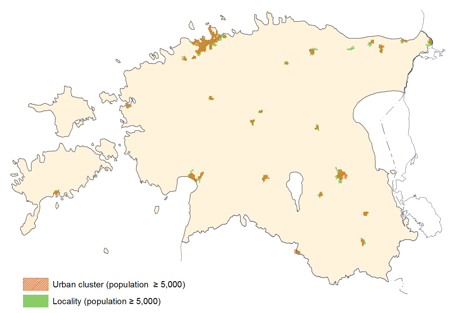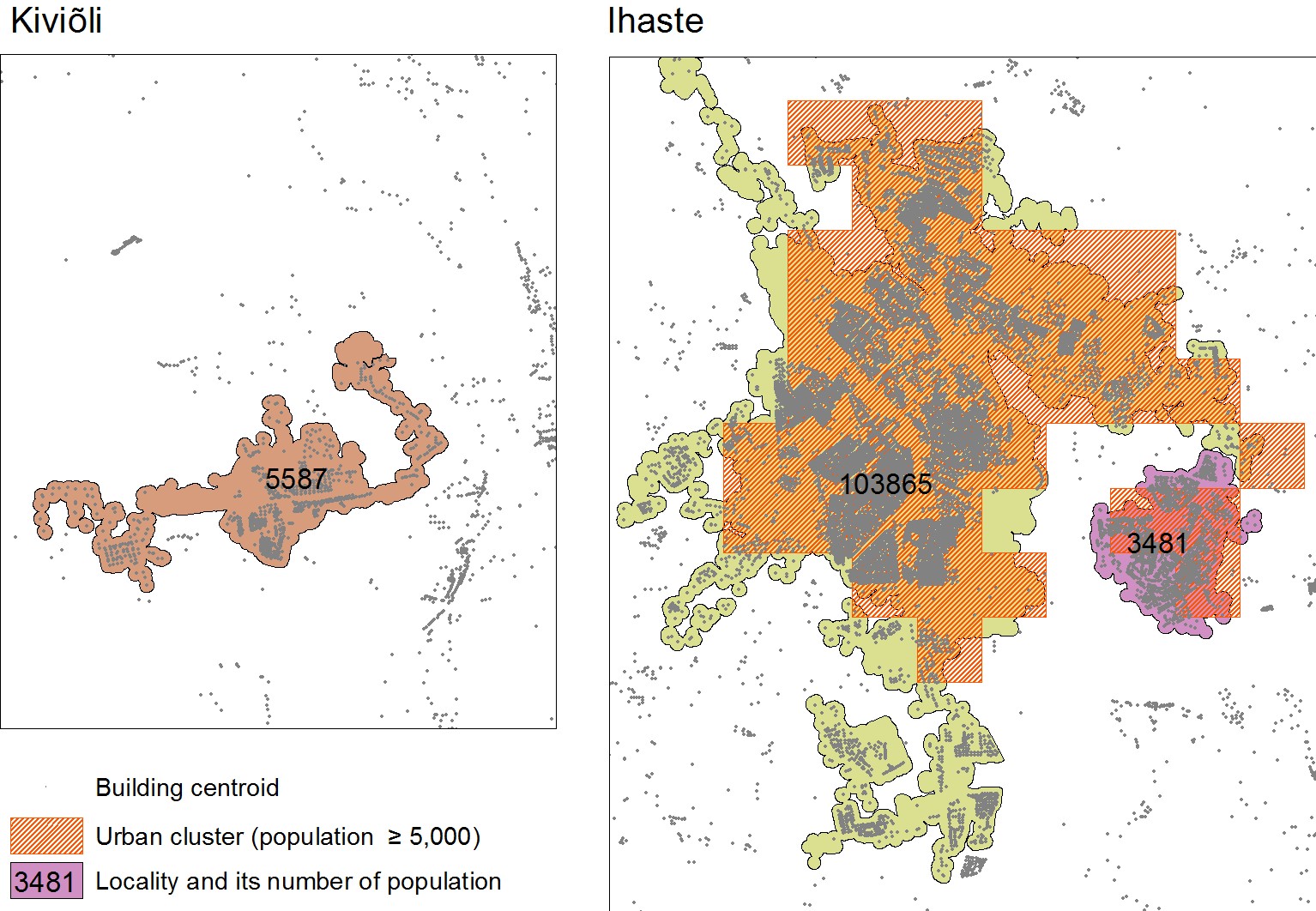 The above-mentioned national localities and European urban areas do not overlap (Figure 2, Table 2). Even though the total number of population in localities outnumbers the population of European urban clusters by about 53,000 inhabitants, this does not mean that localities everywhere cover the urban clusters. Differences can be found in both directions – localities do not include areas which have been included in urban clusters and vice versa. For instance, Kiviõli locality (population 5,687) has been left out from the European dataset. At the same time, Ihaste locality with a population of 3,481 has been left out from the current analysis, as it has not merged with a neighbouring locality, and the threshold for the analysis has been set to 5,000. In the European dataset, however, Ihaste locality has been combined with the neighbouring areas.