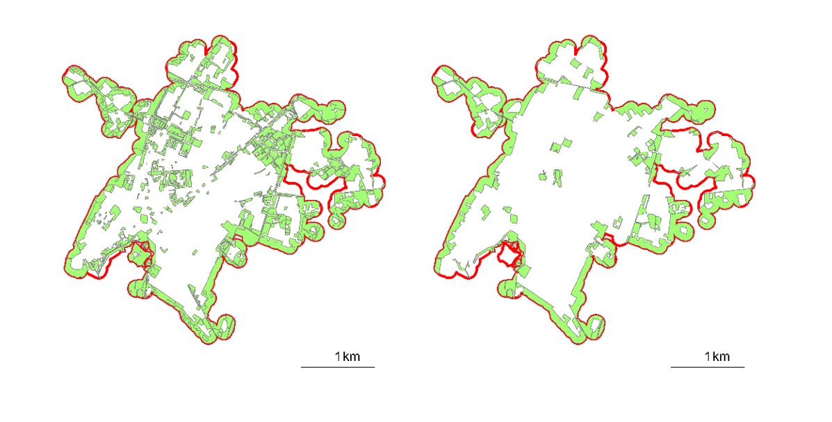 Figure 5. Total initial green areas (left) and final open space green areas (right) in Kuressaare based on Estonian Topographic Database